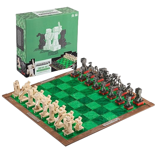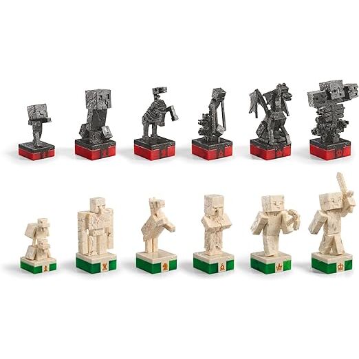 Inspirado en el universo pixelado de Minecraft, este ajedrez de coleccionista enfrenta a héroes y criaturas del popular videojuego. Cada figura tiene un diseño fiel al estilo gráfico del juego.