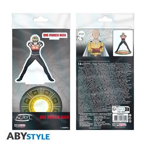 Figura decorativa acrílica con Genos, el poderoso cyborg de One Punch Man, representado con gran nivel de detalle.