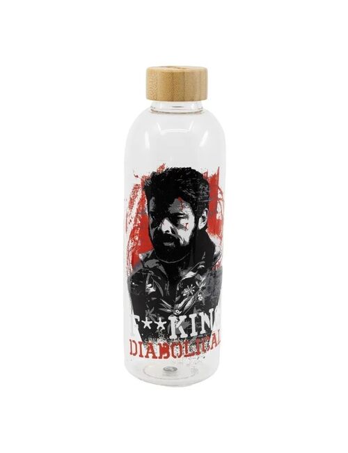 Botella de cristal de gran formato con diseño de The Boys. Decoración en rojo y negro con ilustraciones de personajes como Homelander o Butcher.