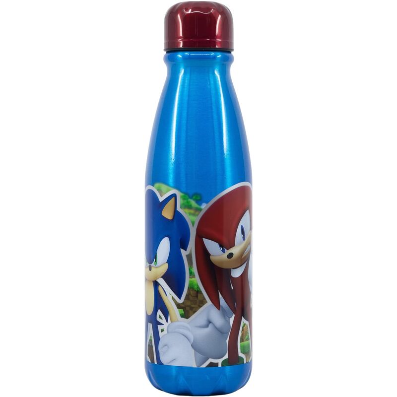 Botella infantil con diseño de Sonic the Hedgehog. Ilustraciones dinámicas del personaje sobre fondo azul con detalles rojos.