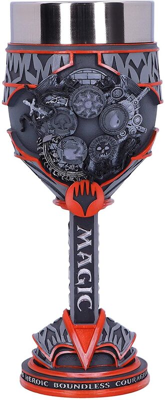 Copa decorativa de Magic: The Gathering. Diseño en relieve con emblemas del juego y estética de arte gótico.