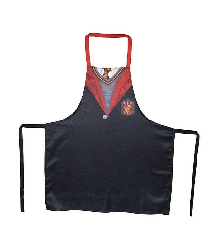 Delantal que simula el uniforme escolar de Gryffindor. Presenta corbata y escudo impresos, con fondo burdeos.