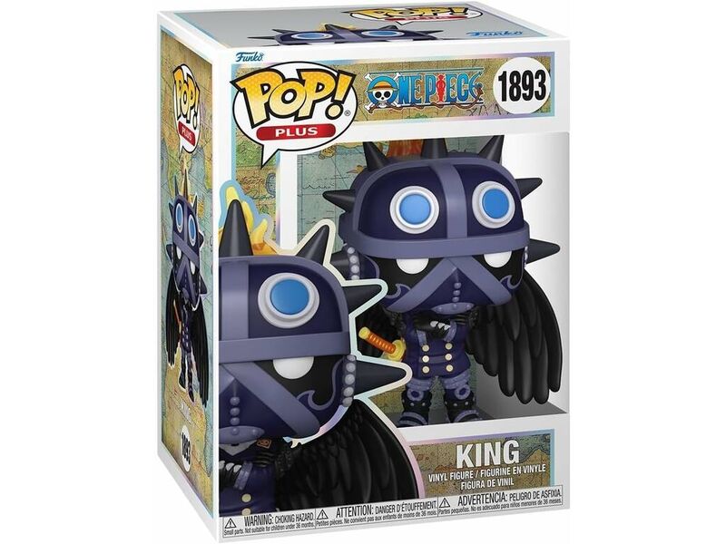 Figura Funko POP! del personaje King de la serie One Piece, presentada en el número 1893 de la colección. Esta figura de vinilo representa con gran detalle a uno de los integrantes más imponentes de los Piratas de las Bestias, conocido por su armadura negra, sus alas oscuras y su expresión intimidante.