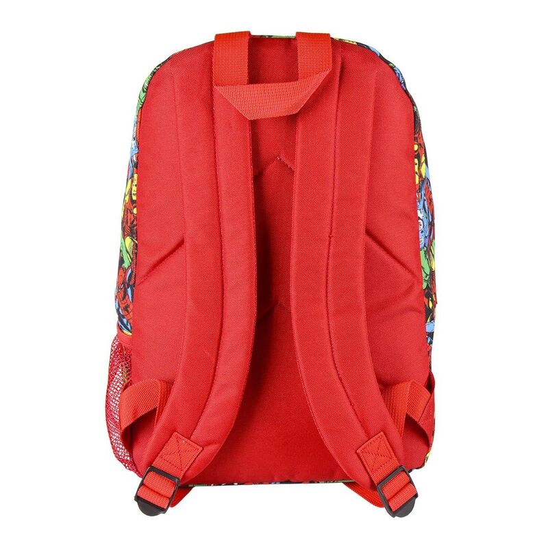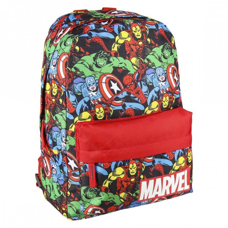 Incluye un compartimento principal con cremallera, asas ajustables y detalles visuales relacionados con Marvel, aportando un toque lúdico y personalizado al uso diario escolar o recreativo.