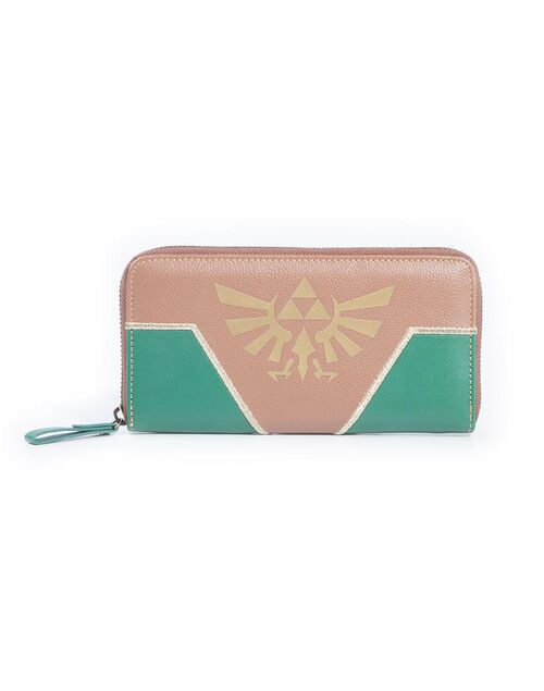 Monedero alargado con cremallera que luce el emblema de Hyrule, representando a la franquicia The Legend of Zelda en tonos beige y verde.