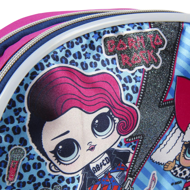 Incluye doble compartimento con cremalleras independientes, interior amplio y diseño divertido con detalles brillantes.