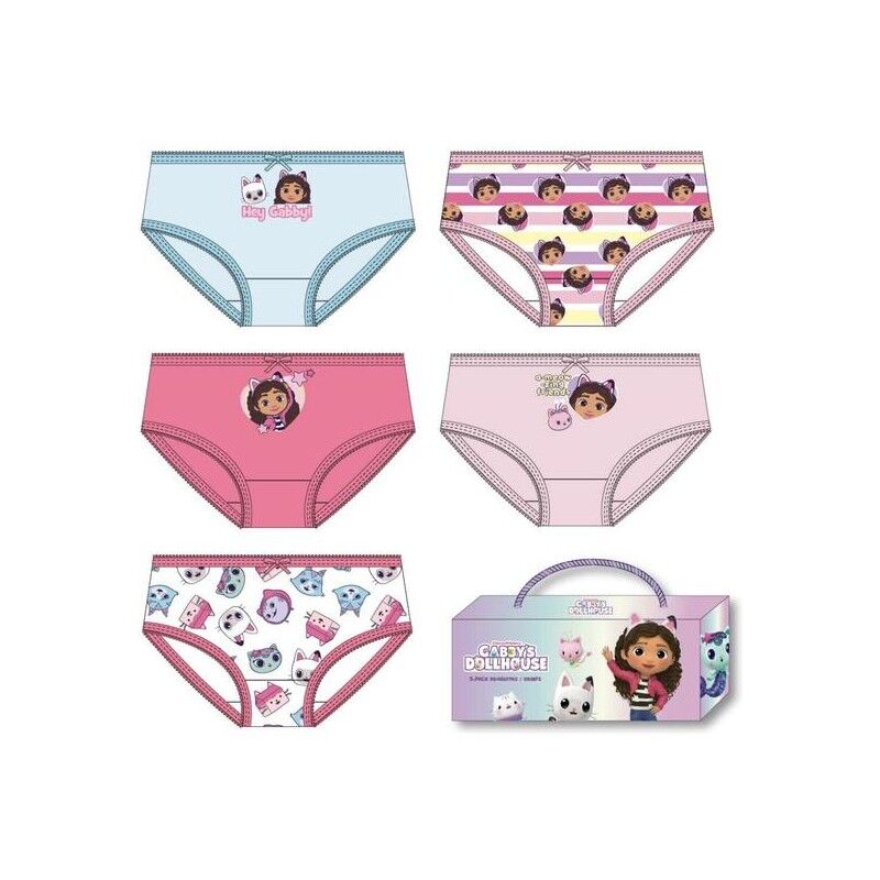Pack de 5 braguitas tipo single jersey con diseños inspirados en Gabby?s Dollhouse, ideal para niñas pequeñas.