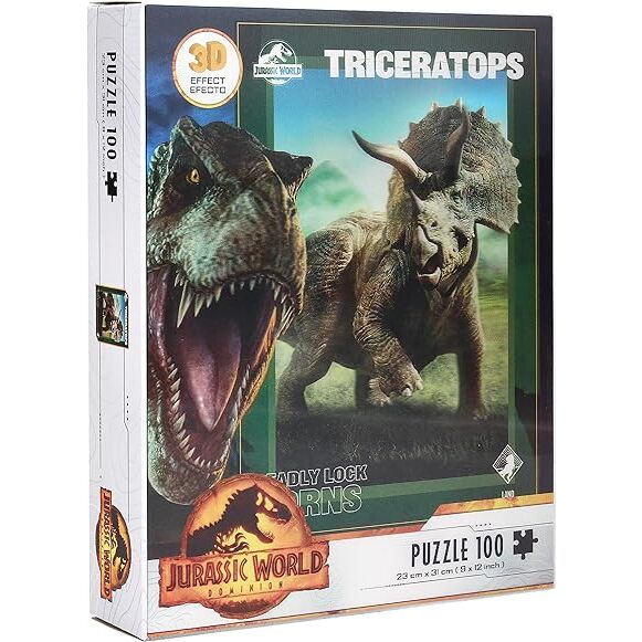 Este puzzle 3D de 100 piezas presenta un Triceratops en efecto póster, con relieve visual y profundidad. Diseño basado en Jurassic World.