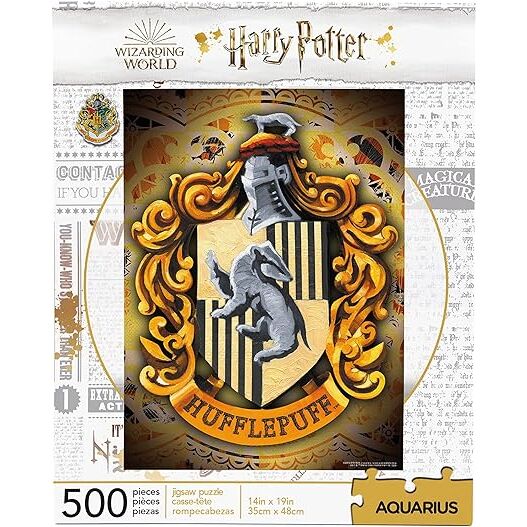 Este puzzle de 500 piezas está dedicado a Hufflepuff, destacando su escudo, colores amarillos y diseño armonioso.