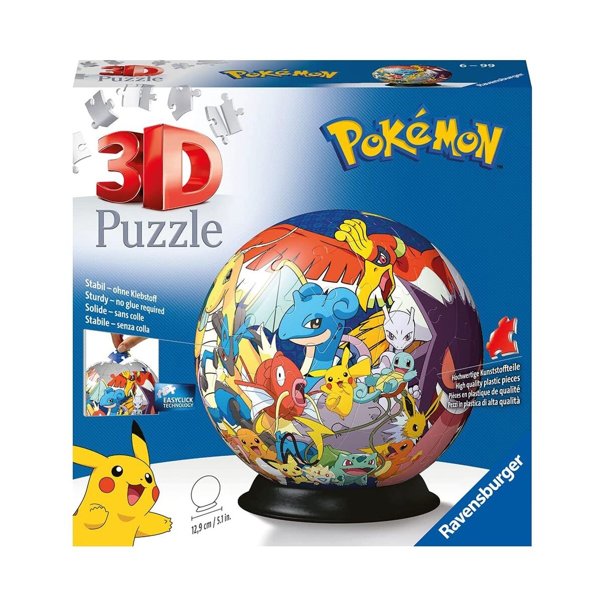 Este puzzle esférico de Pokéball está formado por 72 piezas curvas que encajan sin pegamento. Se monta como esfera estable.