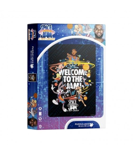 Este puzzle de 1000 piezas de Space Jam 2 presenta un collage dinámico con Bugs Bunny, Lola y el resto del equipo en plena cancha.