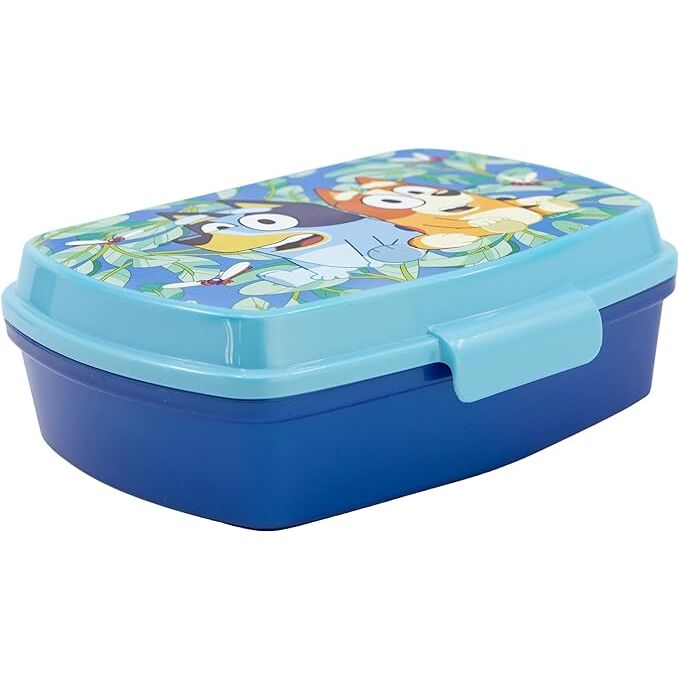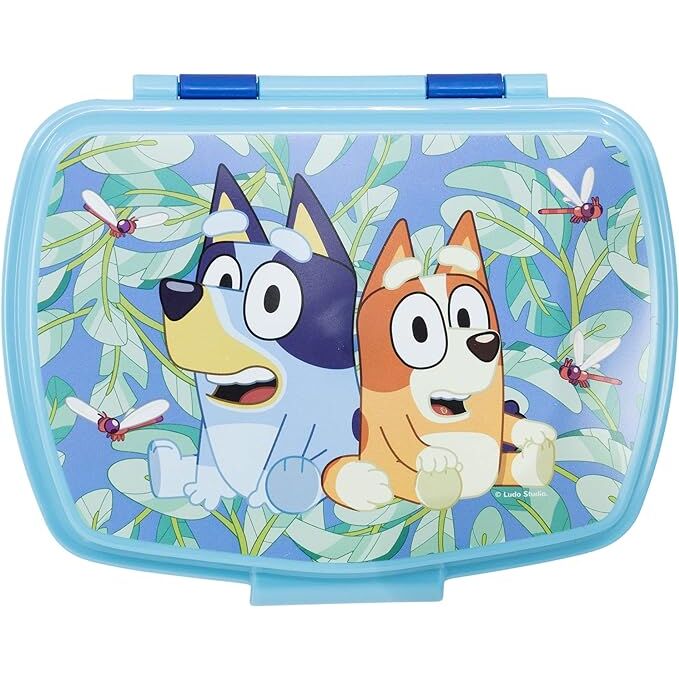 Sandwichera rectangular decorada con personajes de Bluey. Dispone de placas antiadherentes para cocción uniforme y carcasa ligera con ilustraciones infantiles.