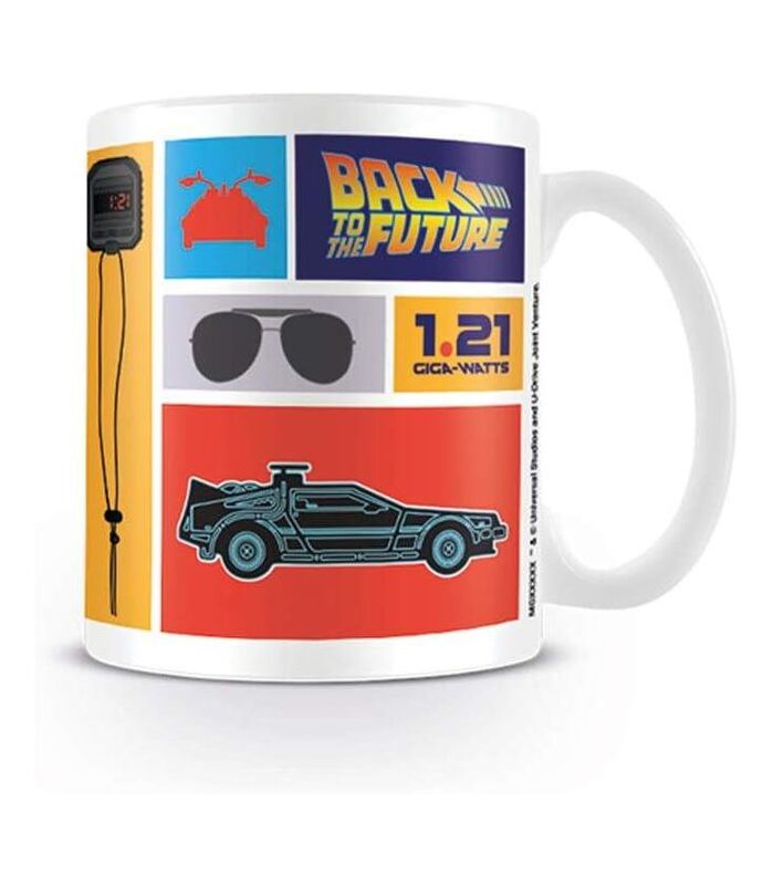 - **Diseño temático:** La taza presenta gráficos y logotipos inspirados en la película "Regreso al Futuro", capturando la esencia y el espíritu de la saga.