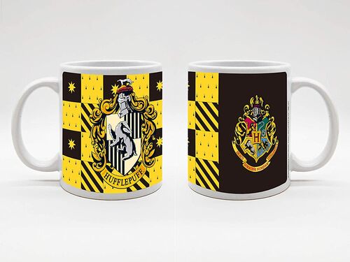 Taza de cerámica de 320 ml decorada con el escudo de la casa Hufflepuff del colegio Hogwarts. El diseño combina los colores amarillo y negro en un patrón clásico con acabado brillante.