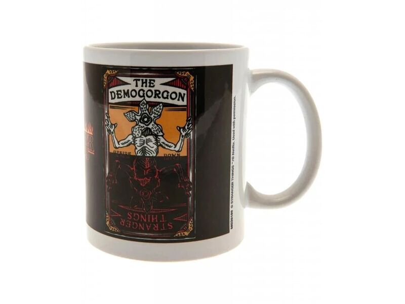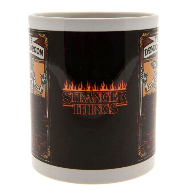 Taza de cerámica con el logotipo clásico de Stranger Things. Fondo negro con letras rojas en estilo ochentero sobre diseño sobrio y elegante.
