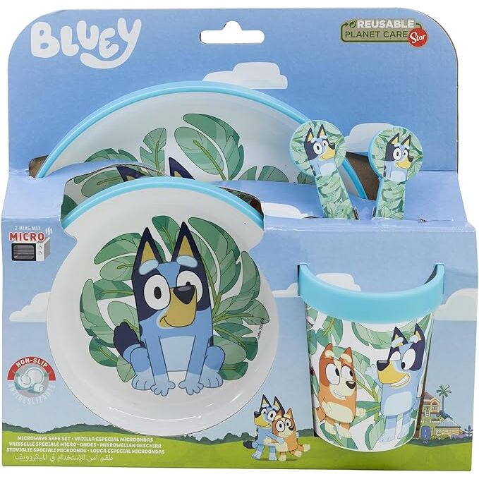 Set de vajilla infantil con diseño de Bluey. Compuesto por plato, cuenco, vaso y cubiertos de tamaño reducido, adaptados para manos pequeñas.