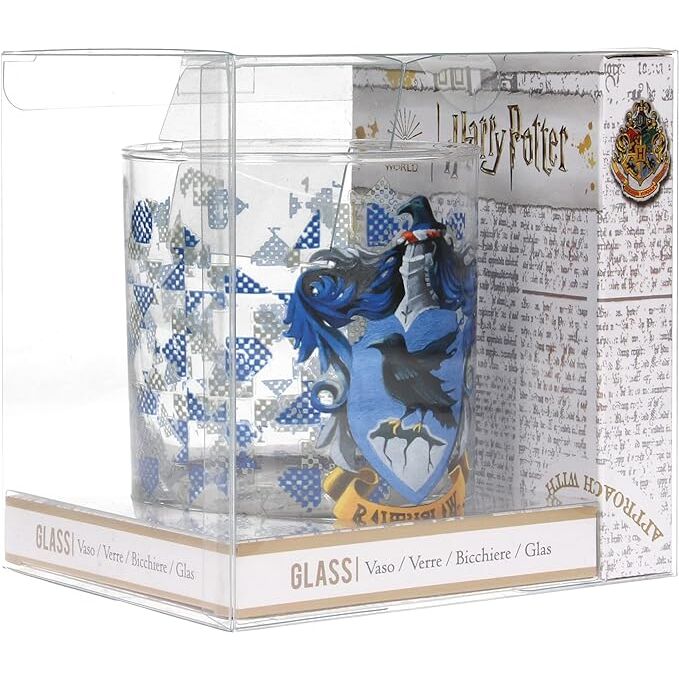Vaso decorado con el emblema de Ravenclaw. Estética refinada en tonos azul y bronce sobre vidrio transparente.