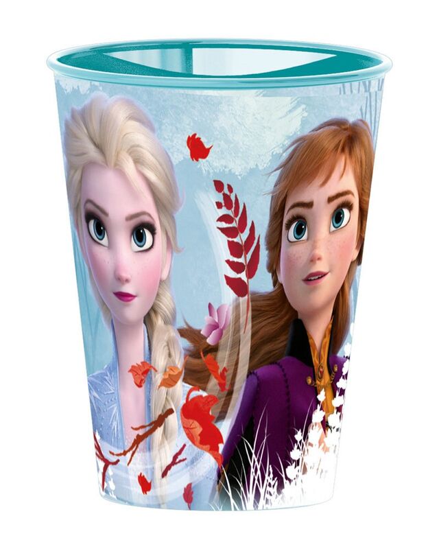 Vaso infantil con diseño de Frozen II. Ilustraciones de Elsa sobre fondo azul con detalles inspirados en el bosque encantado.