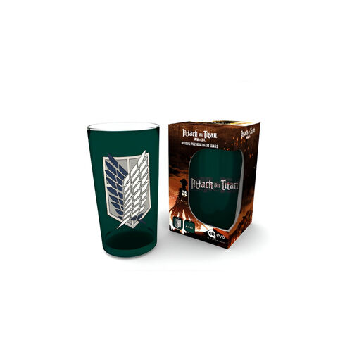 Vaso largo decorado con el símbolo del cuerpo de exploración de Attack on Titan. Diseño en tonos verde militar y gris oscuro.