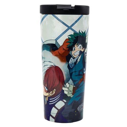 Vaso térmico con diseño de My Hero Academia. Decorado con ilustraciones de Deku en acción sobre fondo dinámico.